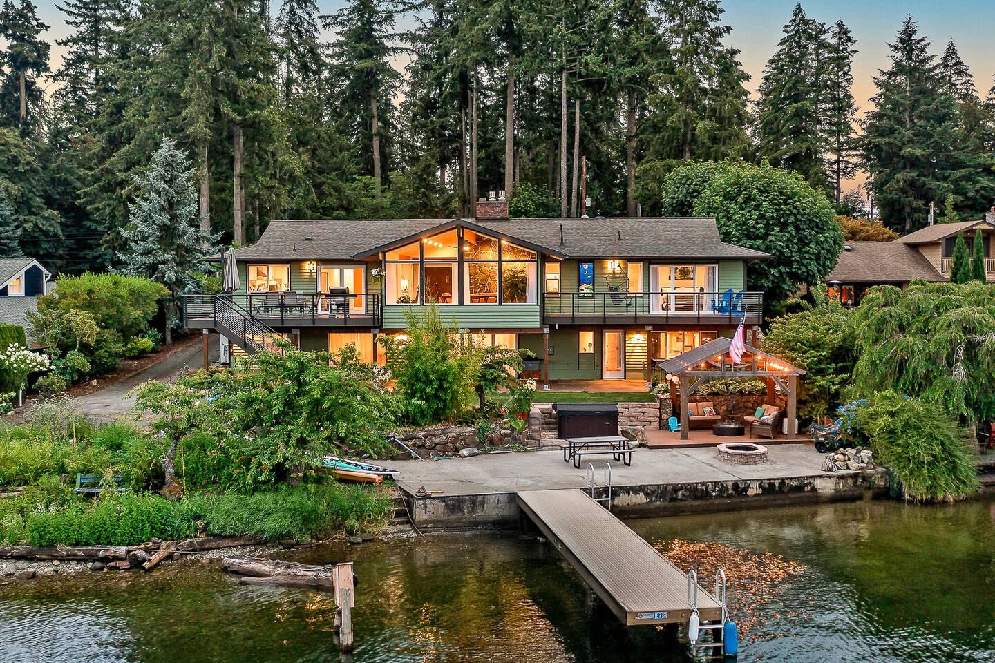 This beautiful lake house has just finished a full remodel and redesign in 2024 to be the perfect vacation rental. Enjoy the year-round hot tub right next to the lake! Sit around the covered fire pit when it's rainy or enjoy s'mores around the lakeside fire pit. And in the morning, enjoy some Mickey Mouse chocolate chip waffles! NOTE: the owners are a nice retired couple who live in the basement unit with a separate entrance. The yard is a shared space. They love guests and are here to help!